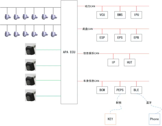 BCM(车身控制器):提供车辆车门状态。当车门开启时泊车系统应被禁用,车门开启会影响摄像头车位识别精度,另外车门开启,车辆边界改变,存在一定碰撞风险;