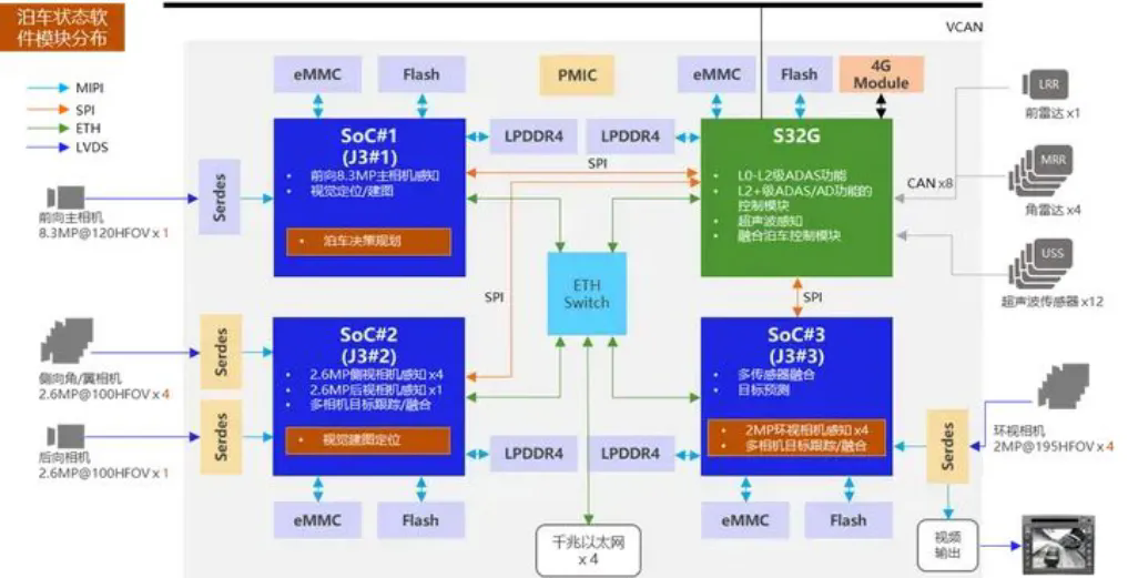 下图是映驰科技三J3+S32G的方案。可以看出:一颗J3负责8M主相机处理、一颗J3负责周视和后视处理,第三课J3负责环视处理,最后由S32G中的M7核负责规控(S32G中有三对M7锁步核)