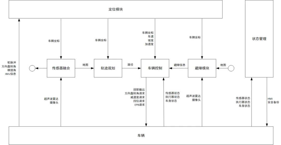 自动泊车一般分为:环境感知、停车位检测与识别、泊车路径规划、泊车路径跟随控制以及模拟显示五个环节,因此自动泊车算法模块可以细化成:传感器融合、轨迹规划、车辆控制、避障模块、状态管理模块、定位模块。算法框图如下: