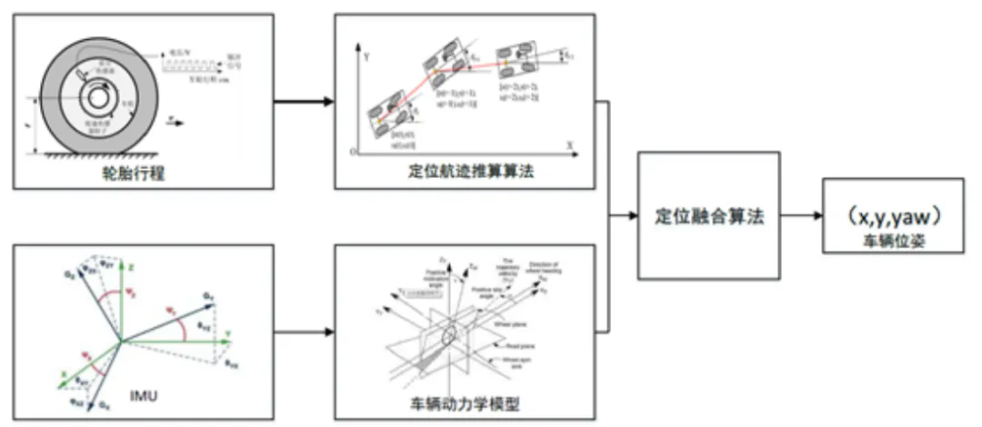 航迹推算算法适用于短行程车辆位姿定位,但该方法存在一些误差。所以需要结合其他方法共同来定位。本方案采用了结合IMU及车辆动力学模型,通过位置估计算法计算短时内高精度位姿变化,通过定位融合算法计算出最终的车辆位姿,其方法流程如下图所示: