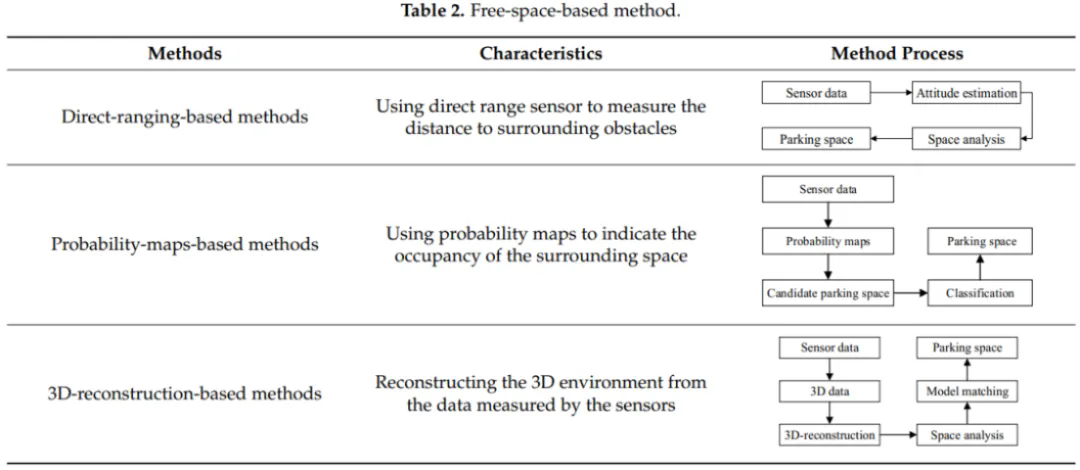 基于自由空间方法是通过识别相邻车辆的周围环境并分析车辆周围的空间结构来实现对可用停车位的检测。常用的传感器有超声波传感器、激光传感器、立体相机、深度相机和其他相机。这些传感器可以感知车辆周围的环境,并为停车位检测提供可靠的参考数据。根据停车位识别方法的不同,基于自由空间的方法可进一步分为基于直接测距的方法、基于概率图的方法和基于三维重建的方法。下面将分析并介绍这三种方法的特点,如表2所示