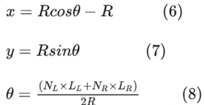 式中:SL 、 SR 分别表示左侧驱动轮、右侧驱动轮行驶的距离;NL 、 NR 分别表示左、右驱动轮脉冲系数;LL 、 LR分别表示左、右驱动轮脉冲计数。
