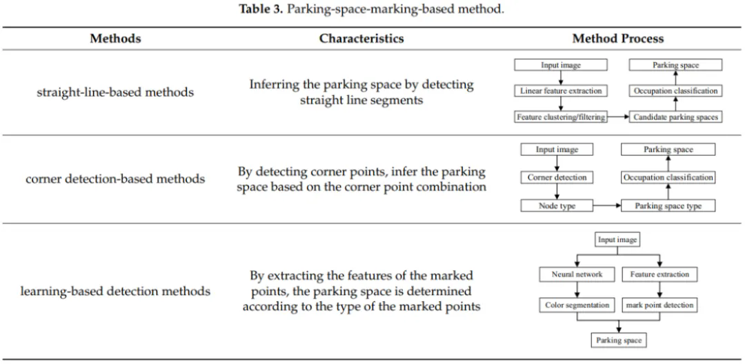 总结:基于停车位标记的方法通过分析道路上的标记来识别停车位,与基于自由空间的方法相反,其性能不取决于相邻停放车辆的存在和位置。然而,这些方法只能在有停车位标记的停车场中正常工作,并且对于停车位标记被遮挡或模糊的情况不适用。