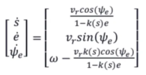 根据运动学方程(2-1)及车辆后轮与参考路径的几何关系