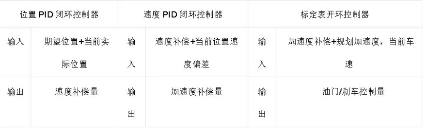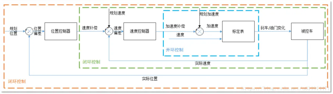 纵向控制的工作原理如图所示。它主要由“位移-速度闭环PID控制器”、“速度-加速度闭环PID控制器”和“速度-加速度-刹车/油门”开环控制器构成。